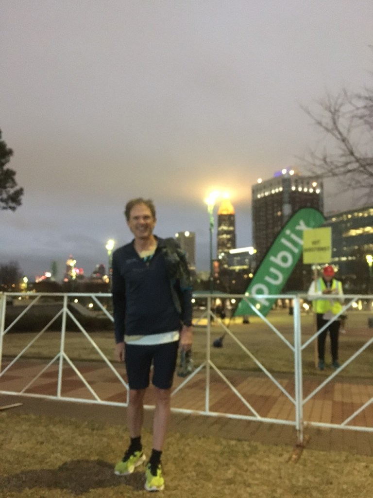 The morning was dark, at a moderate 55 degrees and a breeze, with low slung clouds, barely topping downtown Atlanta’s taller buildings. It was kind of eerie, evoking a sort of Batman motif. My teammates and I arrived about 45 minutes ahead of the start, I think we should have jogged over instead of walking because after our uniform and bib check with the officials we barely had a half hour for the actual warm up. Considering that we got up way early (5AM for 7:30 start), I shouldn’t have been rushed to warm up. Lesson re-learned, get to the start an hour in advance.