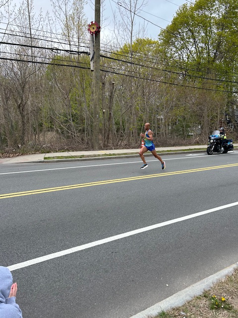 We were off and I found a groove and space right away. After that quick first turn onto the downhill toward the river, I checked my watch, which read 6:10 pace. So I let up a little. By a half mile I could tell the arm warmers wouldn’t be necessary so I pulled them off, and tossed them to Tamara, who was standing just short of the mile marker. Split 6:20 for mile 1. A little quick but with the net downhill, it was right on and I felt decent.
