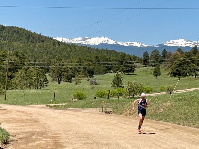 Tamara provided support every 2-3 miles, and I took in a few ounces of Maurten 160 drink at each stop, I figured that would be enough and once I ran out there’d be water. Going out was hard! We moved from our condo at 7,400 feet a month ago and even though we’re staying at 5,900 feet now I think I could tell that my breathing was more labored. It did get better once I settled in, after about 15-20 minutes. Nevertheless, I had planned on averaging 7:40s-7:50s on the way up and to be well under an hour at the Peak to Peak Highway (7.5 miles). But the hills were relentless, and I slowed way down on the steeper sections. As a result, I was about 59:26 (7:56 pace) at the turn around.