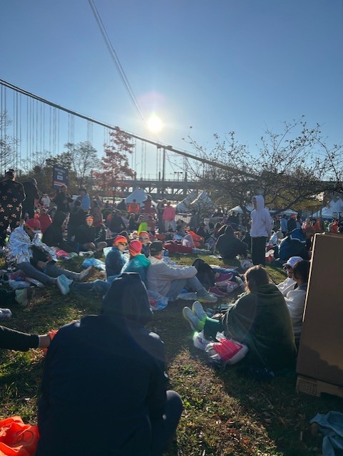 Race Day. I slept better than usual for the night before a marathon, waking up at 3:30 but did not get up until 4:00, and arrived to the ferry terminal at a bit after 5:00 and took the 5:30 ferry to Staten Island. We arrived at the athletes village at about 7. It all went pretty smoothly. I tried to relax and stay warm, gnawing on bagels (2) and taking in some caffeine and fluids. Visited the porta johns more times than I can ever recall before a race. But the lines weren’t bad, they were set up very well for that.
